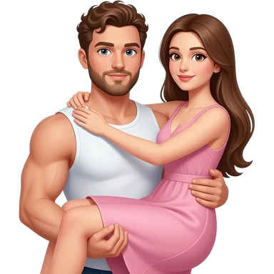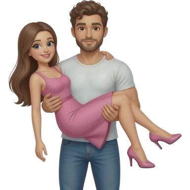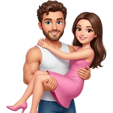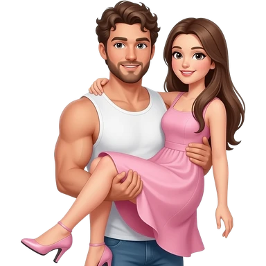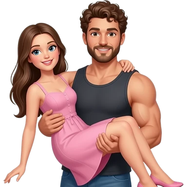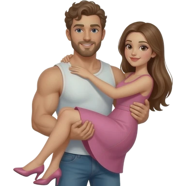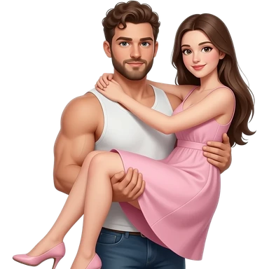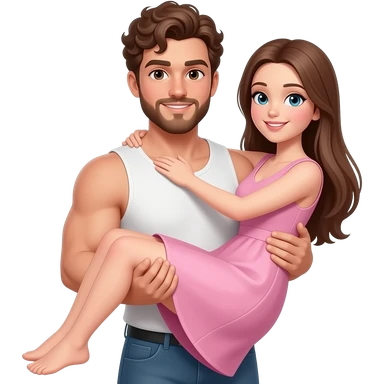Realistic white skin brown short curly hair with beard muscular man carrying white skin long straight brown hair girlfriend wearing aesthetic pink dress HD emoji