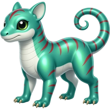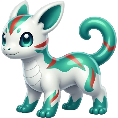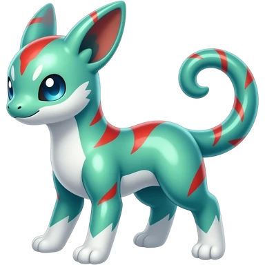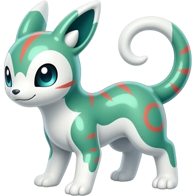 Shiny iridescent glossy oily smooth silky soft White with green-teal-turquoise-gradient with red streak markings and white belly and white points beautiful handsome gorgeous aesthetic colorful vibrant Vernid-Trico-species-Fakemon-creature by LiLaiRa, 4 legs, 1 tail, random markings, (full body) emoji