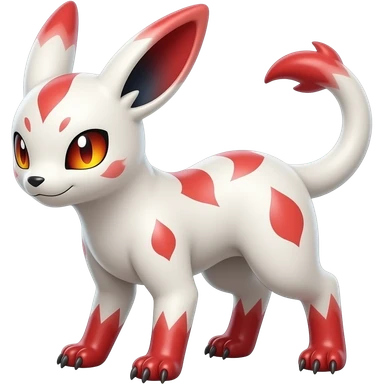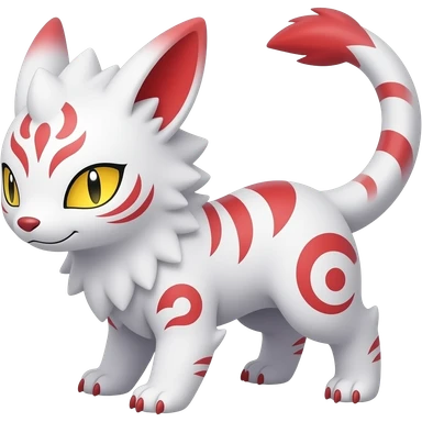 Hyper-realistic oily smooth silky soft White white with red gradients, and yellow, slit eyes, oriental intricate markings handsome cool edgy aesthetic colorful vibrant Vernid-Trico-species-Fakemon-creature by LiLaiRa, 4 legs, 1 tail, random markings, (full body) emoji