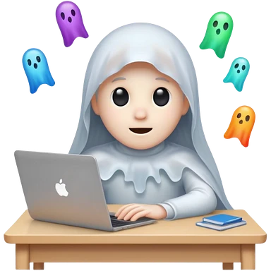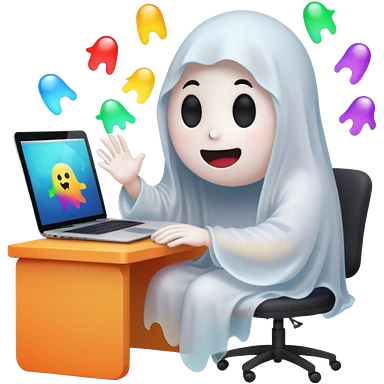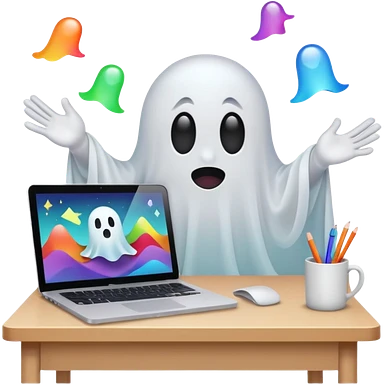 A cute ghost sits in front of a desk and is designing it with a laptop. see a laptop screen, and there is a photoshop screen on the screen. On the ghost surface, many shapes are leaving. emoji