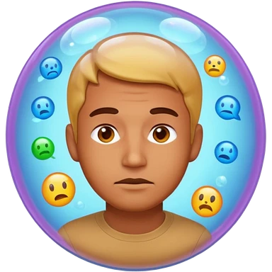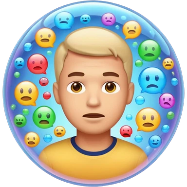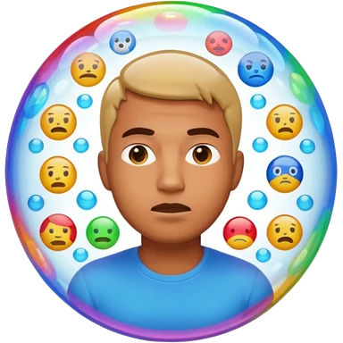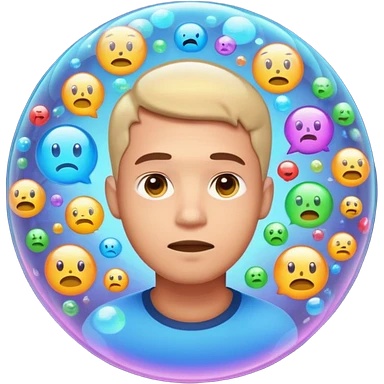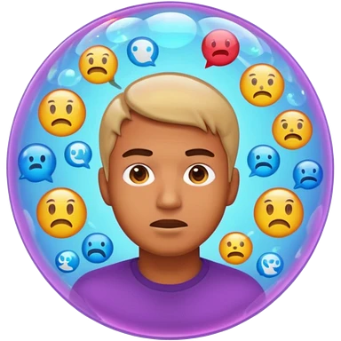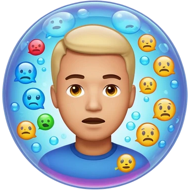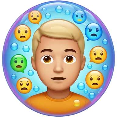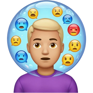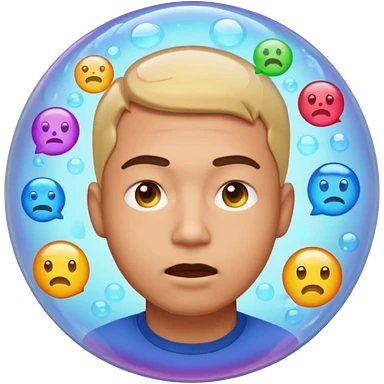 Realistic emoji-style man trapped inside a glowing filter bubble. The bubble contains identical social media icons and repeating content symbols. Outside the bubble are colorful diverse icons he cannot see. The man looks comfortable but unaware, expressing narrow perspective.emoji