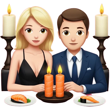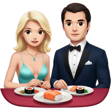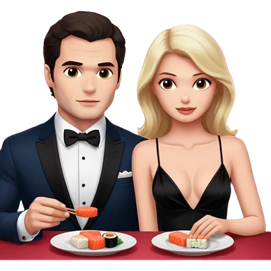 realistic photo of Henry Cavill with a beautiful victoria secret model on a candle lit sushi date emoji
