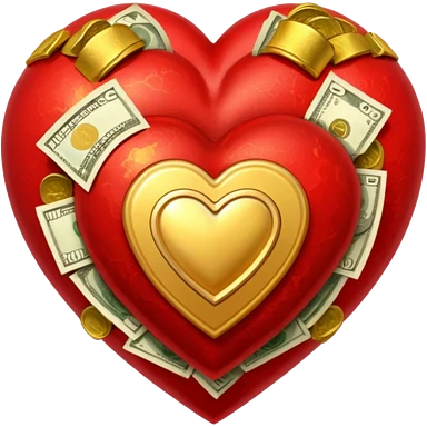 "Realistic HD red heart fused with cash and gold elements, heart seamlessly blended with money textures and molten gold details, dramatic warm glow, luxurious but clean, white background." emoji