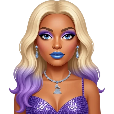 Lil Kim with periwinkle eyes, long blonde hair with periwinkle ombre, blue eyeshadow, blue lipstick, periwinkle grammy dress, earrings and necklace emoji