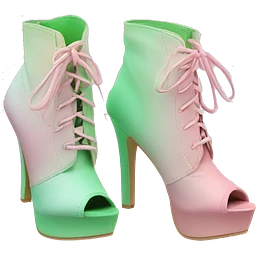 Realistic isolated top front view of a pair of pastel pink to pastel blue ombre pair of cut out mesh high heel combat boots. emoji