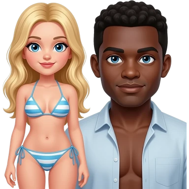 una ragazza con fisico perfetto bionda occhi azzurri in Bikini realistico con uomo nero realistico emoji