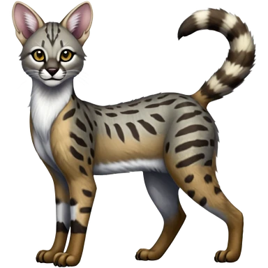 Realistic patterned marked edgy greyish blackish whitish silvery Shiny Colorful Glossy Genet-Caracal-Lion-Bobcat-fusion-animal-hybrid-creature, full body, tufted ears, long thin tufted tail emoji