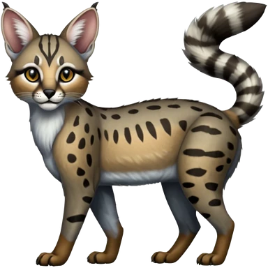 Realistic patterned marked edgy greyish blackish whitish silvery coppery Shiny Colorful Glossy Genet-Caracal-Lion-Bobcat-fusion-animal-hybrid-creature, full body, big-tufted-bat-ears, long-thin-tufted-white-tipped-tail emoji