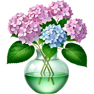 Hyperrealistic, 3D rendering, still life, smooth, clean thin lines, 8k, pale pink, and white lush Hydrangeas with vivid leaves in 3D sparkling realistic crystal translucent glass vase. 1x1 in size emoji