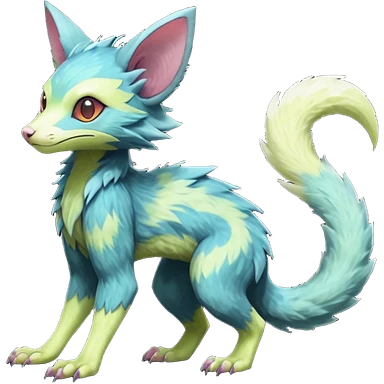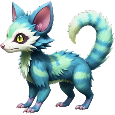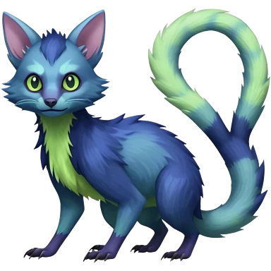 Realistic Sharp pastel-indigo and pastel lime-green detailed Colorful translucent luminescent Trico-Lykoi-Noibat-Sergal-Furret-Ferret-Wolverine-Vernid-furry-fursona-fusion-Fakemon-animal-hybrid-creature, full body emoji