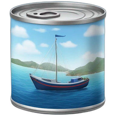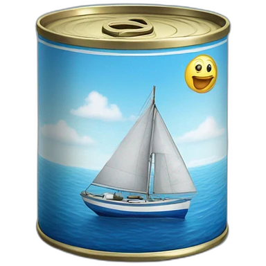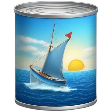 Realistic small can of tuna showing a blue sailling boat on a sea background emoji