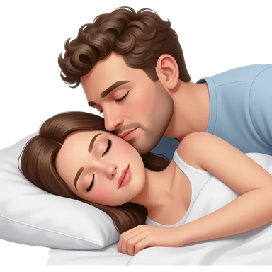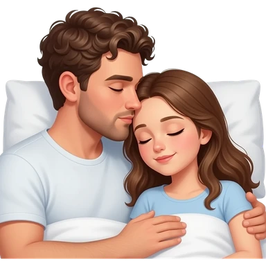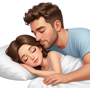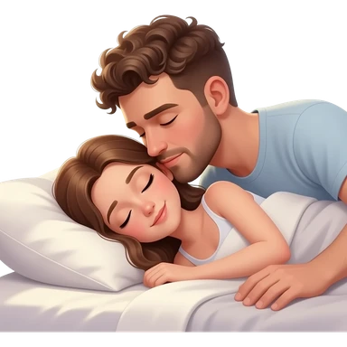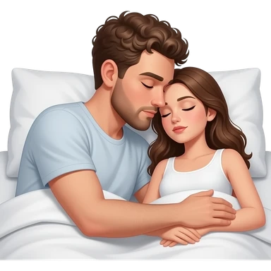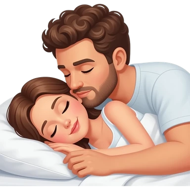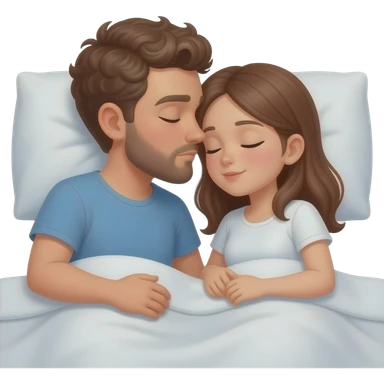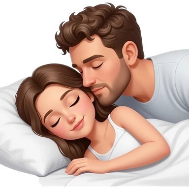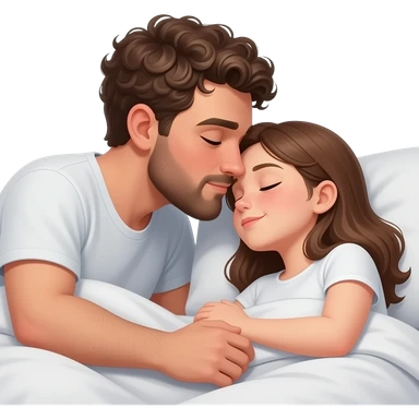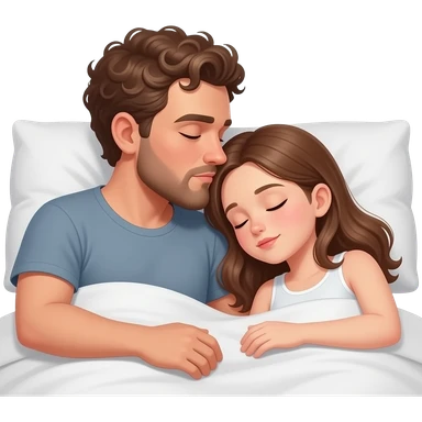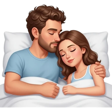 Realistic white man brown super short curly hair with beard hugging while sleeping in bed with realistic white girl brown hair emoji | AI Emoji Generator