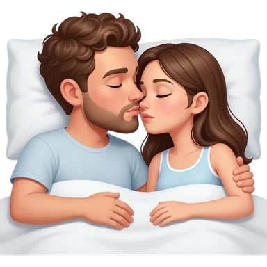 Realistic white man brown super short curly hair with beard round nose bridge kissing while sleeping in bed realistic white girl brown hair emoji