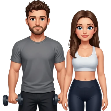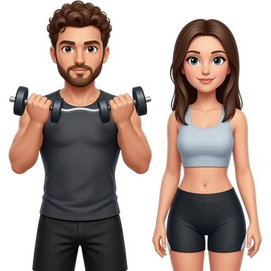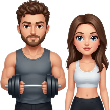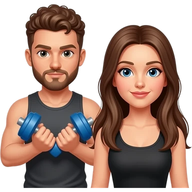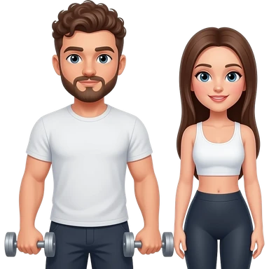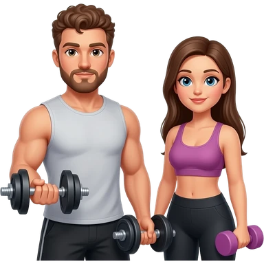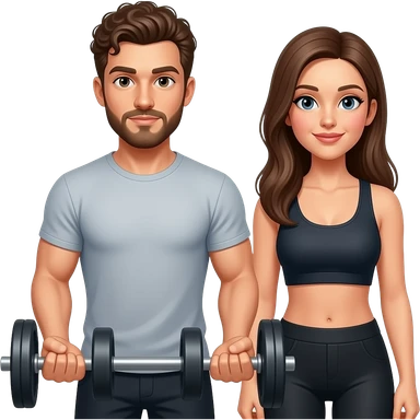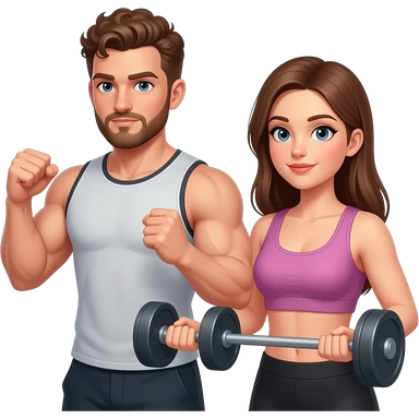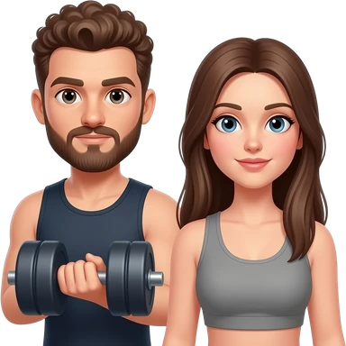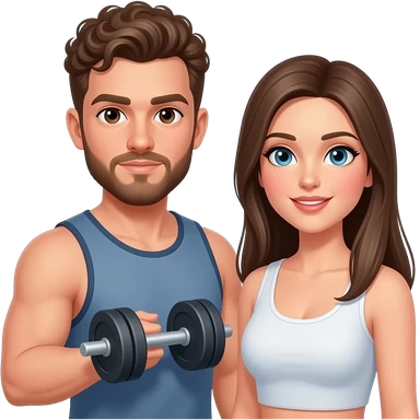Realistic white man brown super short curly hair with beard working out with realistic white woman brown long straight hair aesthetic emoji