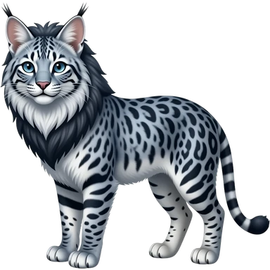 Realistic rosette-patterned marked edgy bluish greyish blackish whitish silvery Shiny Colorful Dusky Dark Glossy Genet-Caracal-Lion-Bobcat-fusion-animal-hybrid-creature, full body, tufted ears, long thin tufted tail emoji