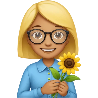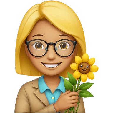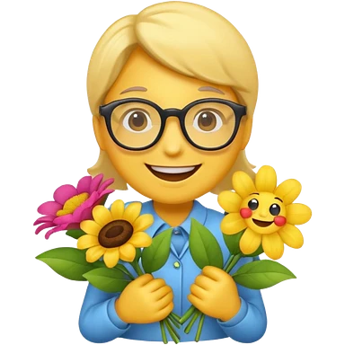 Create a yellow emoji holding flowers and wearing glasses with a joy expression emoji