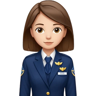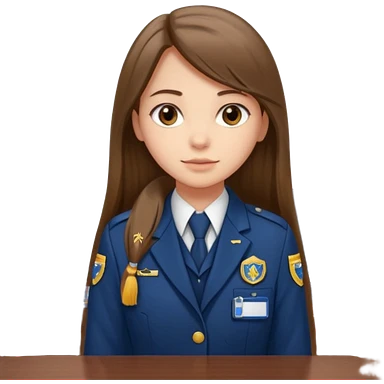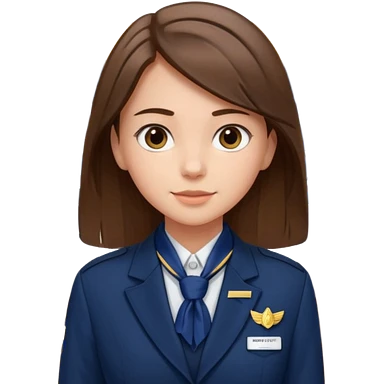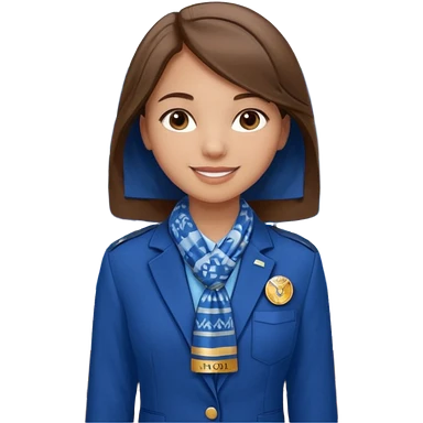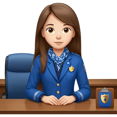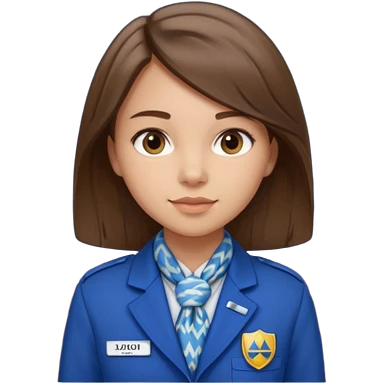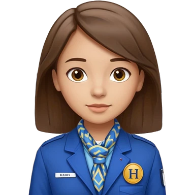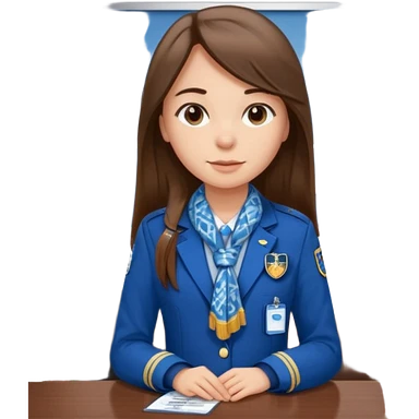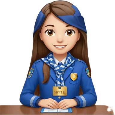 Young girl, long brown straight hair, wearing uniform jacket with hotel name badge, tasteful scarf, stand behind the desk emoji
