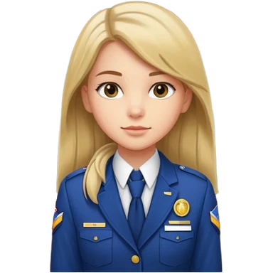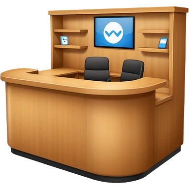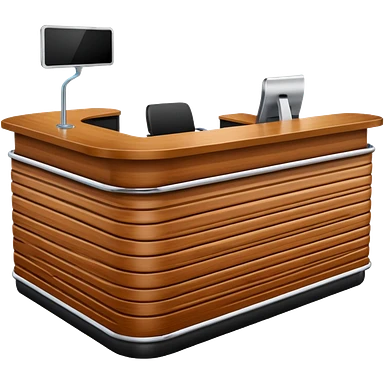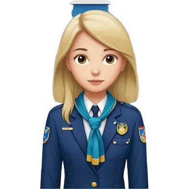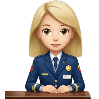 Young girl, long straight hair, wearing uniform jacket with hotel name badge, tasteful scarf, stand behind the desk emoji