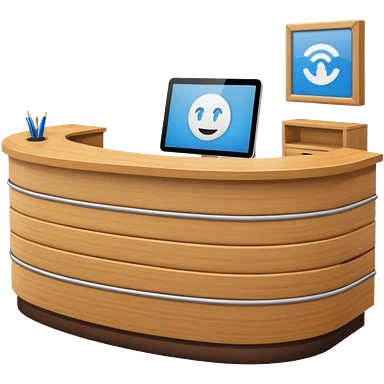 Young girl, straight hair, wearing uniform jacket with hotel name badge, tasteful scarf, stand behind the desk emoji