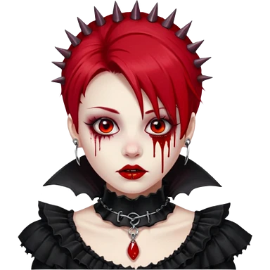 Shiny beautiful cute cool gorgeous attractive gothic vampiric lady with bloody hair, bloody lips, bloody face, blood-choker, spiked collar, frills, black dress, red rubies emoji