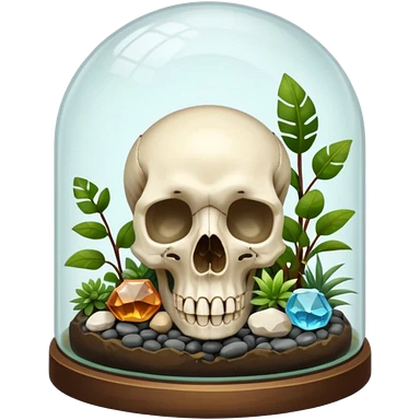 A terrarium glass dome with an animal skull inside, shiny pebbles and crystal inside. And plants inside emoji