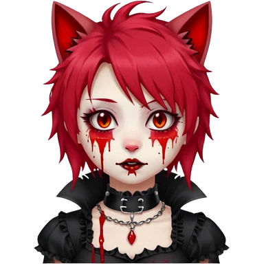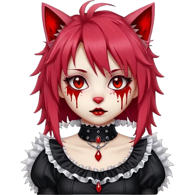 Shiny furry beautiful cute cool gorgeous attractive cute gothic anime cat-girl-lady with bloody hair, bloody lips, bloody face, blood-choker, spiked collar, frills, black dress, red rubies, messy tousled hair emoji