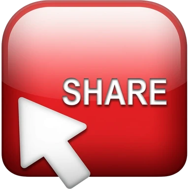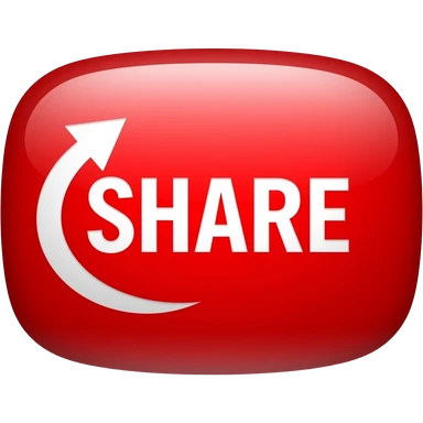 Red 3D share button, white text “SHARE”, arrow icon, glossy, rounded, soft glow, clean background emoji | AI Emoji Generator