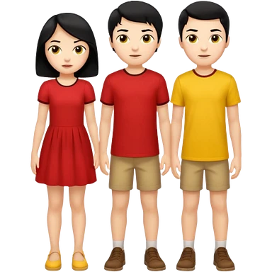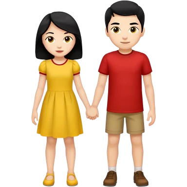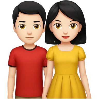 a boy with black hair and red shirt is between the legs of a girl with black hair and yellow dress emoji