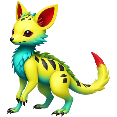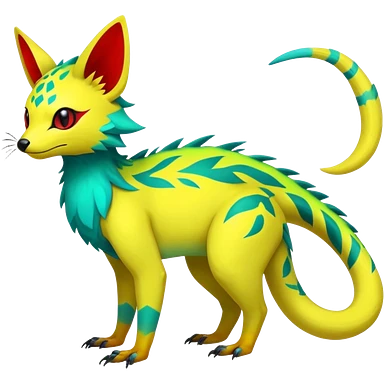 Rare realistic exotic edgy tropical cute yellow, with neon-green, neon-red, and neon-cyan markings epic pretty beautiful handsome gorgeous aesthetic colorful vibrant Vernid-Trico-species-Fakemon-creature by LiLaiRa, 4 legs, 1 tail, random markings, (full body) emoji