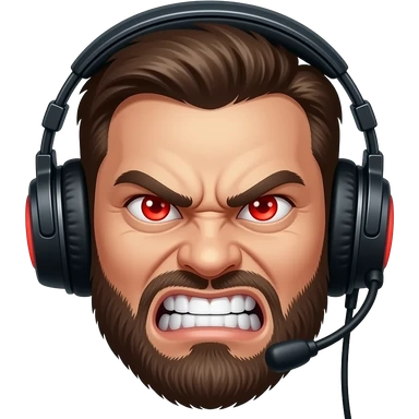 A cartoon gaming emoji of an angry gamer with headset, glowing red eyes, clenched teeth, exaggerated expression, bold outlines, vibrant colors, transparent background emoji