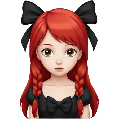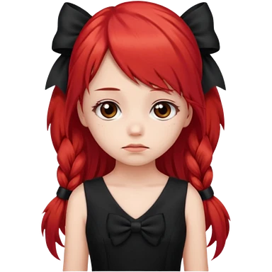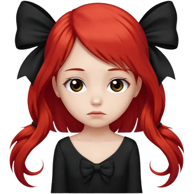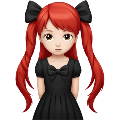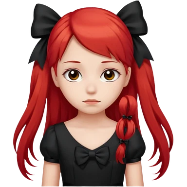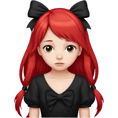 red long twin tail hair girl with black bow on her hair wearing black dress with a sad face emoji