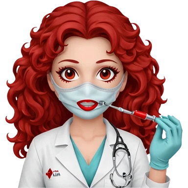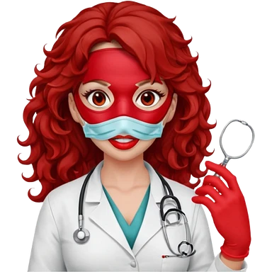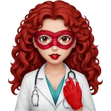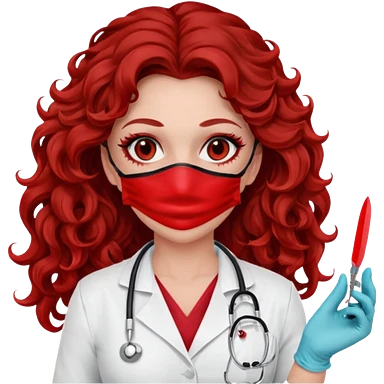 Lilith scalpel in hand, evil surgeon sexy surgeon clothes. She has red eyes. Hair is long. Hair is brown and curly hair. Wears sexy doctor outfit with red gloves. Covers mouth and neck mask rec red emoji