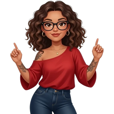 A woman with tan skin, shoulder-length curly hair (sometimes straightened), black square glasses, two nose studs, and visible tattoos (left shoulder and inner arms). She is wearing a flowy red top and dark jeans. She's surrounded by stars and dancing emoji