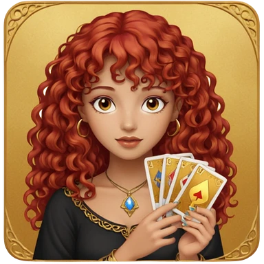 Red curly hair with bangs beautiful girl with brown tarot gold cards emoji