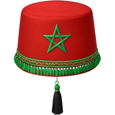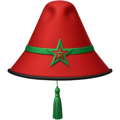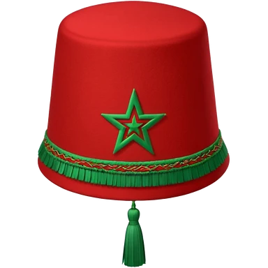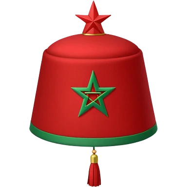 Red Moroccan fez hat with a flat top, straight sides, a green five-pointed star on the front, and a thin black tassel hanging from the right side. emoji