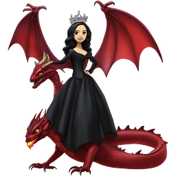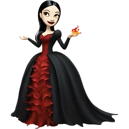 Lavish black evening gown with see-through gloves, Jenna Ortega as Addams woman wearing a steampunk mini tiara, very large blood red evil-looking horned old dragon emoji