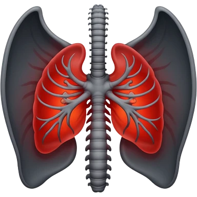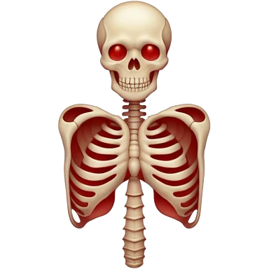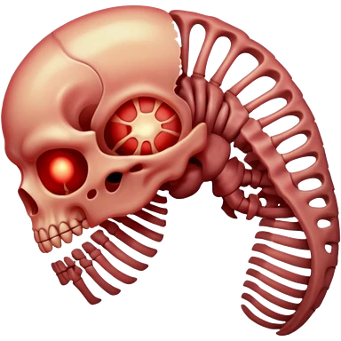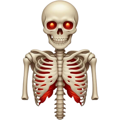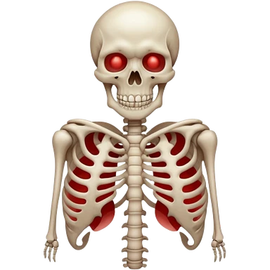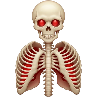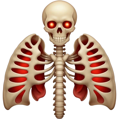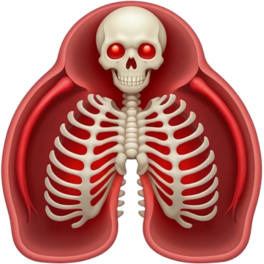 Minimalist emoji-style sticker of a ribcage x-ray with a curled-up demon inside, lines in faint white on black background, subtle red eye glow emoji