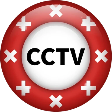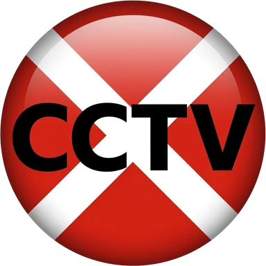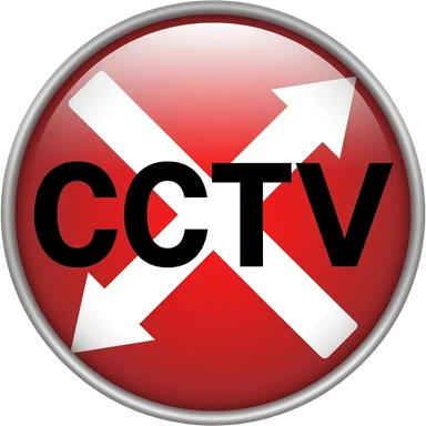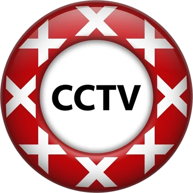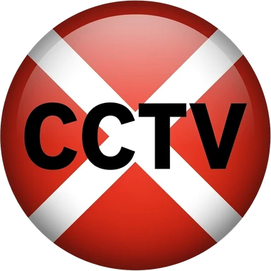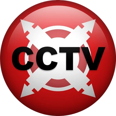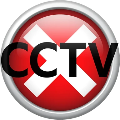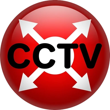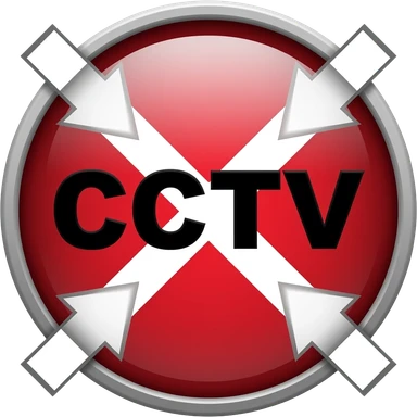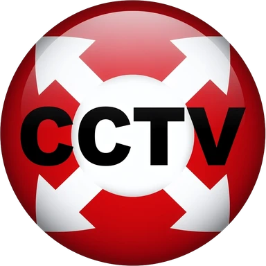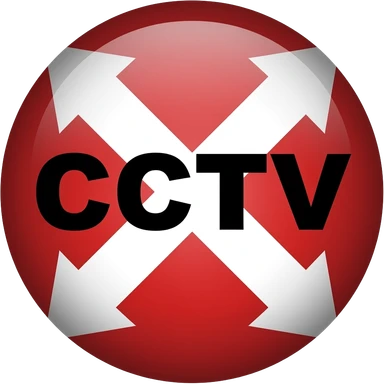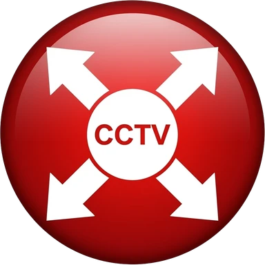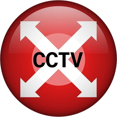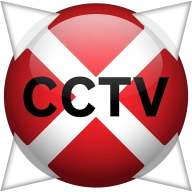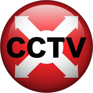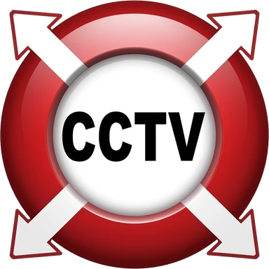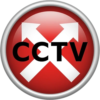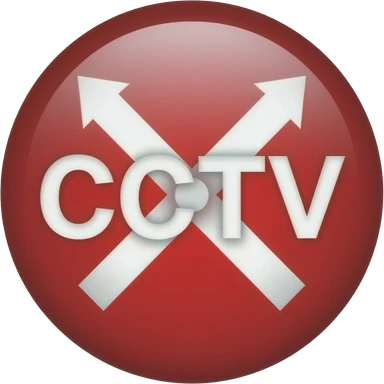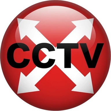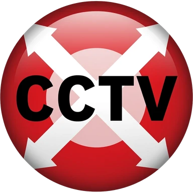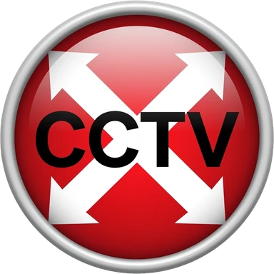 Red filled circle with white X and arrow on all end points on the X white circle in the middle. Big bold CCTV word in the centre in black emoji