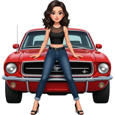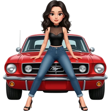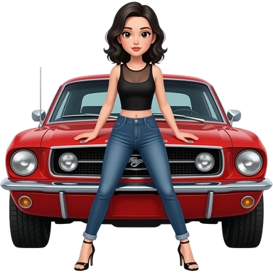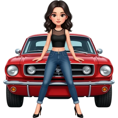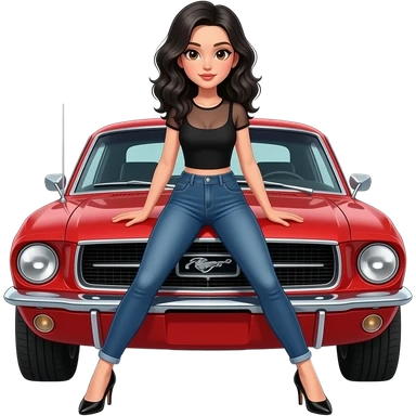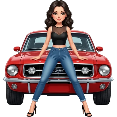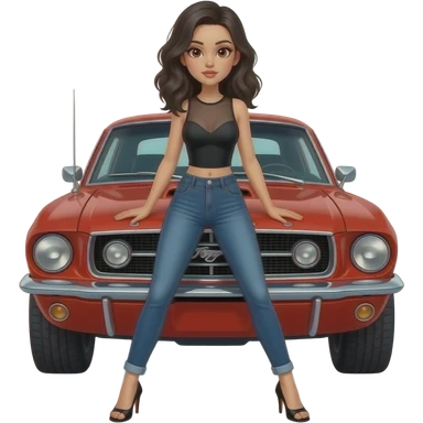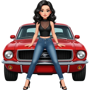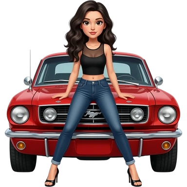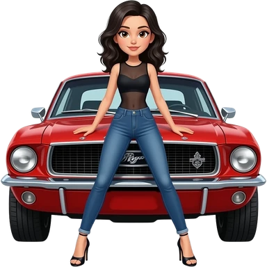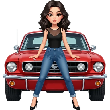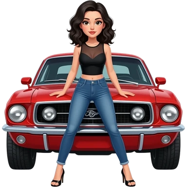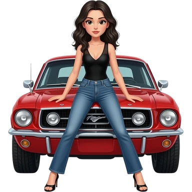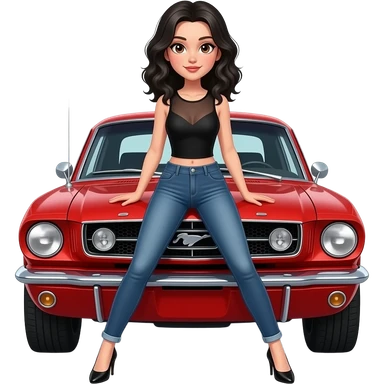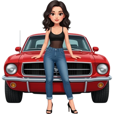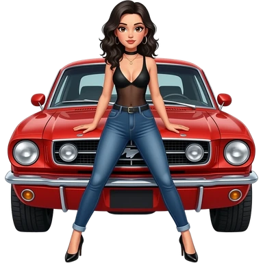 Pale girl with black wavy hair and brown eyes in front of a red ford mustang 1968 coupe. Girl wearing a sheer black sleeveless top, jeans and heels with visible toes. Legs wide spread and hands resting on the hood. emoji