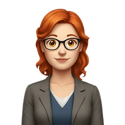 female teacher with red hair, glasses, freckles, plump, smiling emoji
