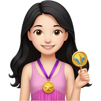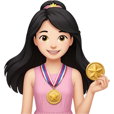 black haired girl wearing pastel pink with medals remove any hats, make her smile, make her hair longer emoji