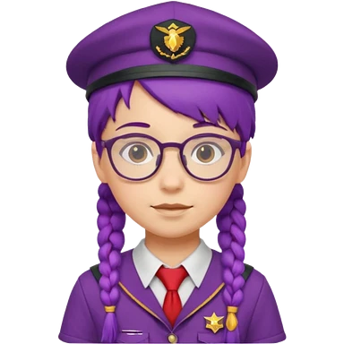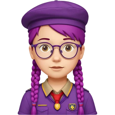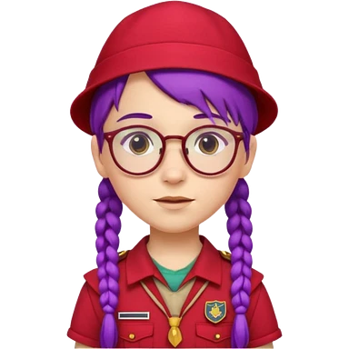 red uniform wearing scout kid with braids and glassess with hat purple haired emoji