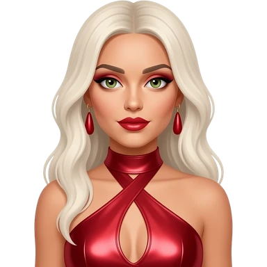 Taylor Swift with blue eyes, long blonde hair, red eyeshadow, red lipstick, red metallic halter dress, red necklace and earrings emoji