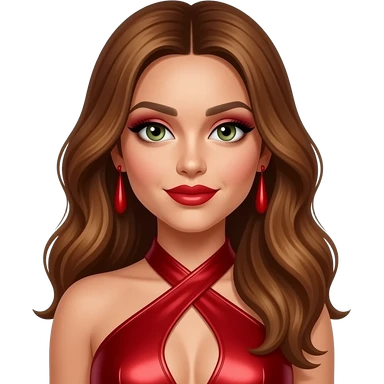 Jesy Nelson from Little Mix with hazel-green eyes, long auburn hair, red eyeshadow and lipstick, red metallic halter dress, red earrings emoji
