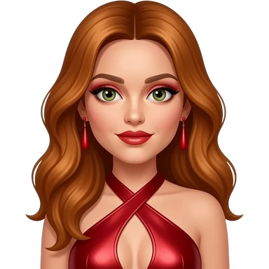 Jesy Nelson from Little Mix with hazel-green eyes, long ginger auburn hair, red eyeshadow and lipstick, red metallic halter dress, red earrings emoji