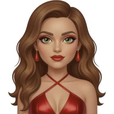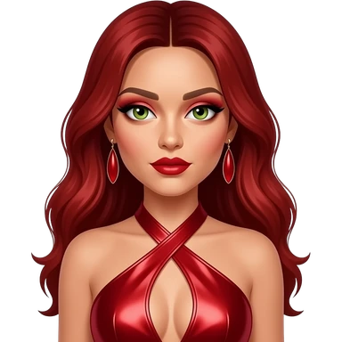 Jade from Bratz with white skin, green eyes, long black hair with bang, red eyeshadow, red lipstick, red metallic halter dress, red earrings emoji