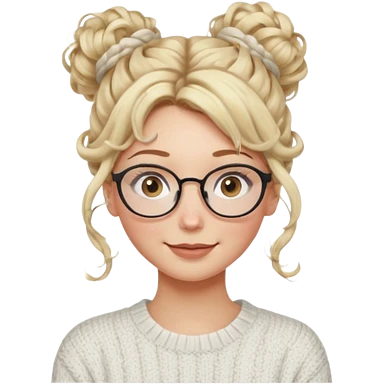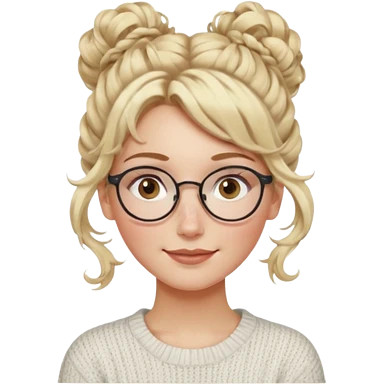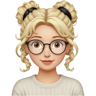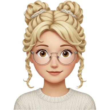 blonde hazel eyes woman with a white cable knit sweater and clear glasses on her head and a curly messy bun with tendrils of hair flowing down her face and she is happy pale, some freckles, blush. she has a cateye wing and long lashes emoji