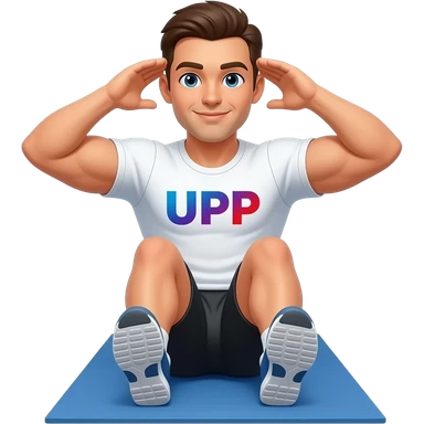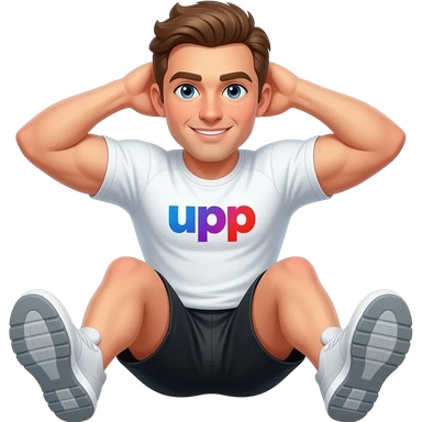 guy-wearing-all-white-workout-top-and-blakc-shorts-doing-sit ups with-_upp_-written-in-middle-of-his-shirt in blue purple red gradient with no matt under him emoji