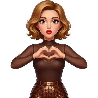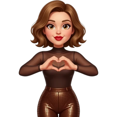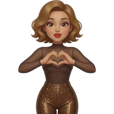 glamours,-tanned,-very-beautiful-woman-with-big-plump-red-lips,-long-lashes,-honey-silky-very short- hair,-wavy-hair,-hazel-eyes- wearing-Chocolate-brown-sheer-Long-sleeved-bodysuit-Brown-sequinned-pants-Her-eyes-sparkle-and-she-is-smiling-hands-up-making-a-heart-symbol-- emoji