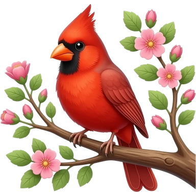 Red cardinal in a tree with pink and green flowers emoji